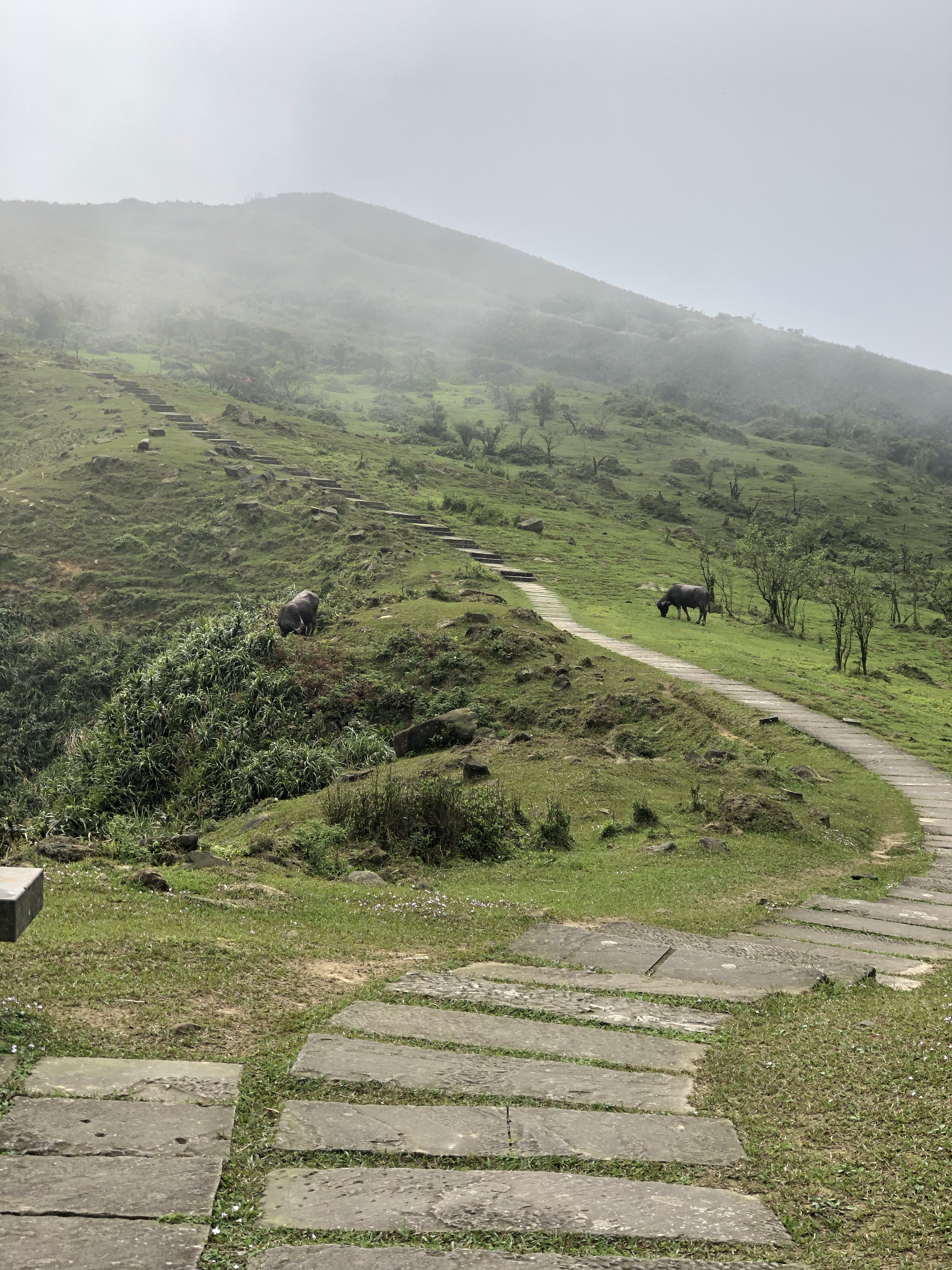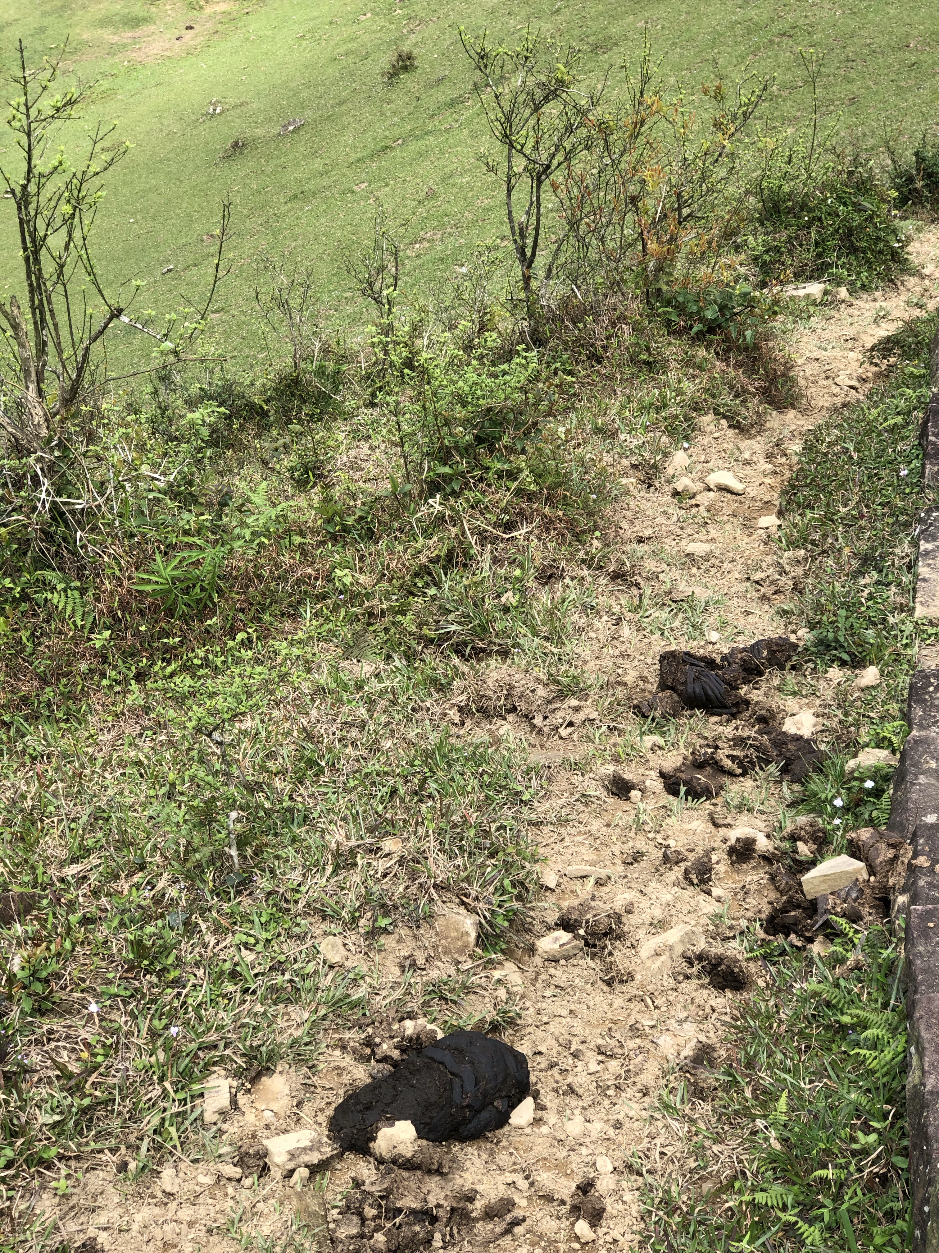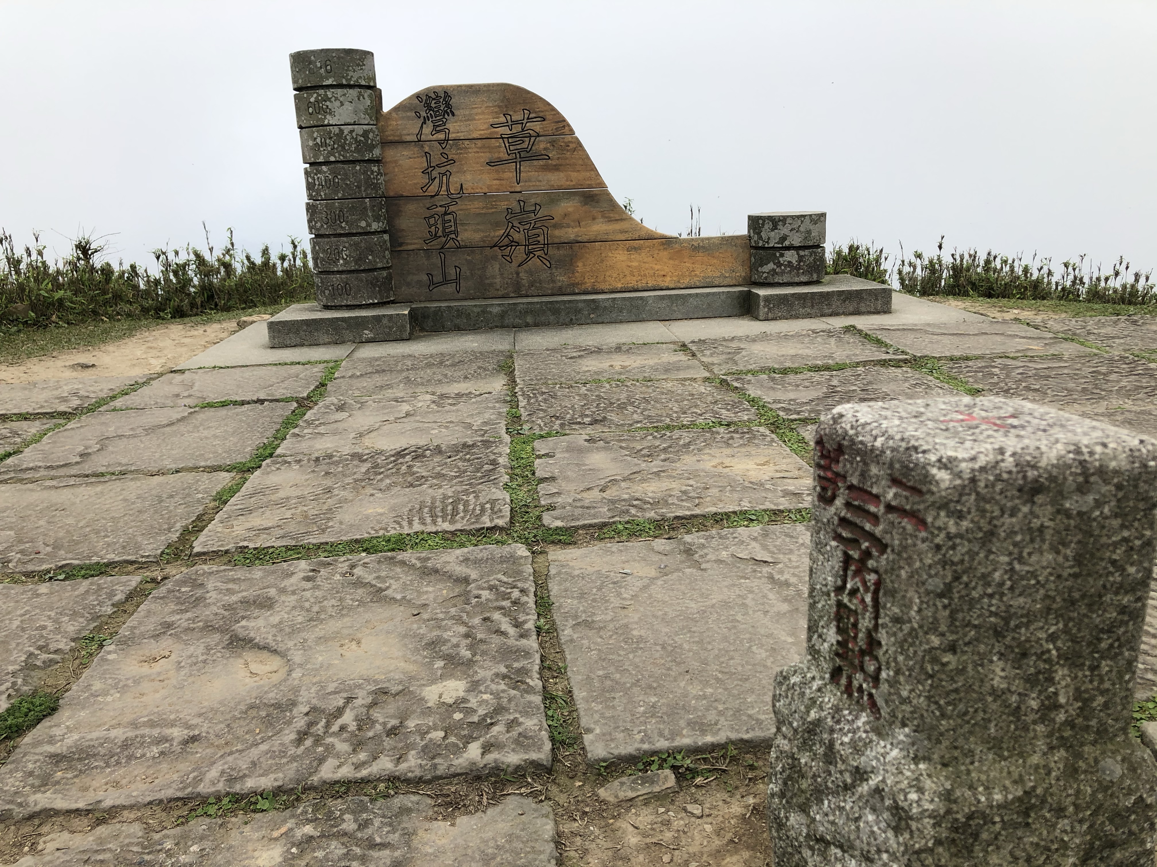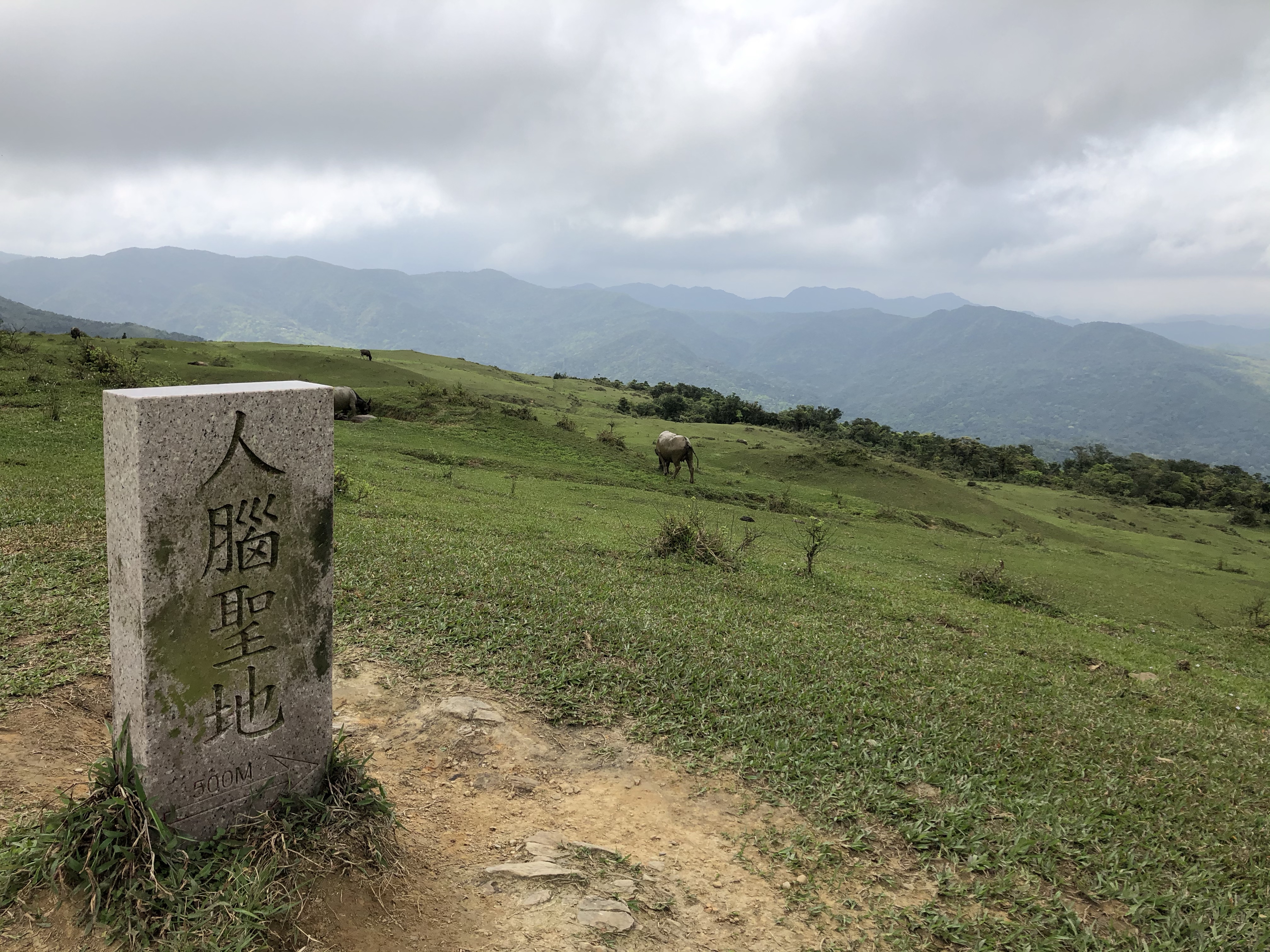 喝完咖啡、吃完鳳梨在桃源谷頂休息將近40分鐘就出發前往大里了,循著這一路的牛糞漸漸就導引出牛群了!然後一路爬上草嶺的灣坑頭山,沒想到還是個二等三角點。