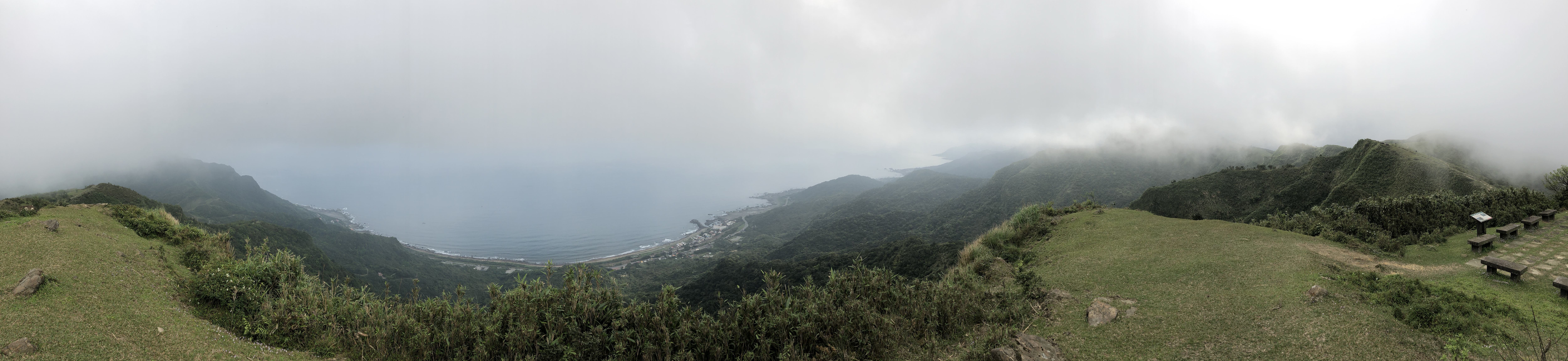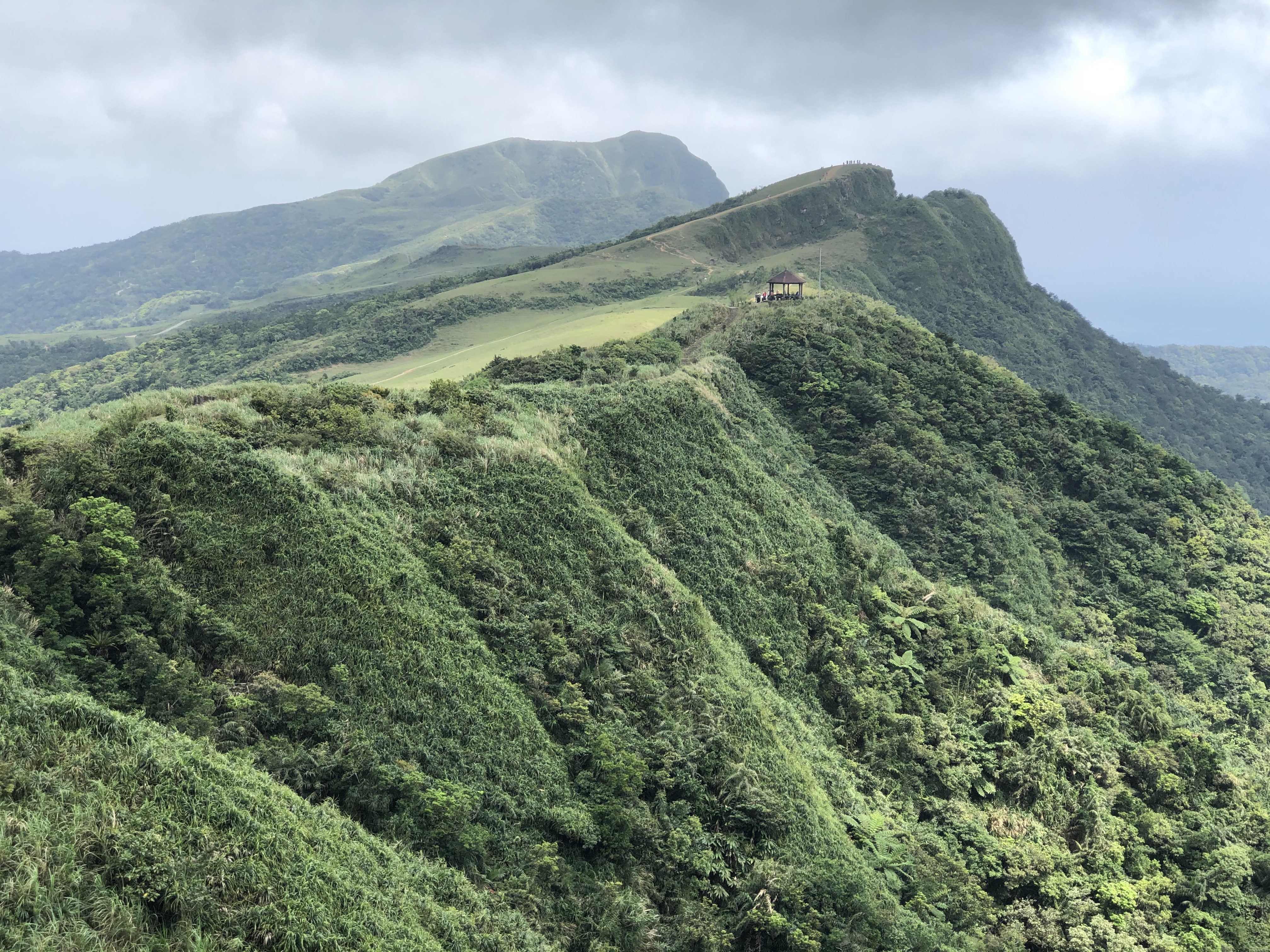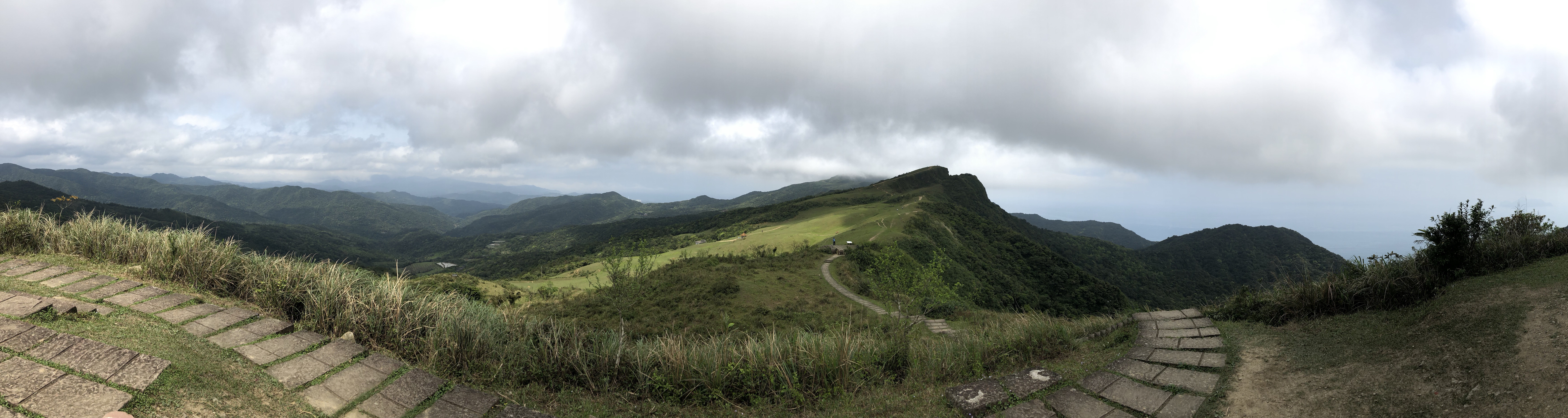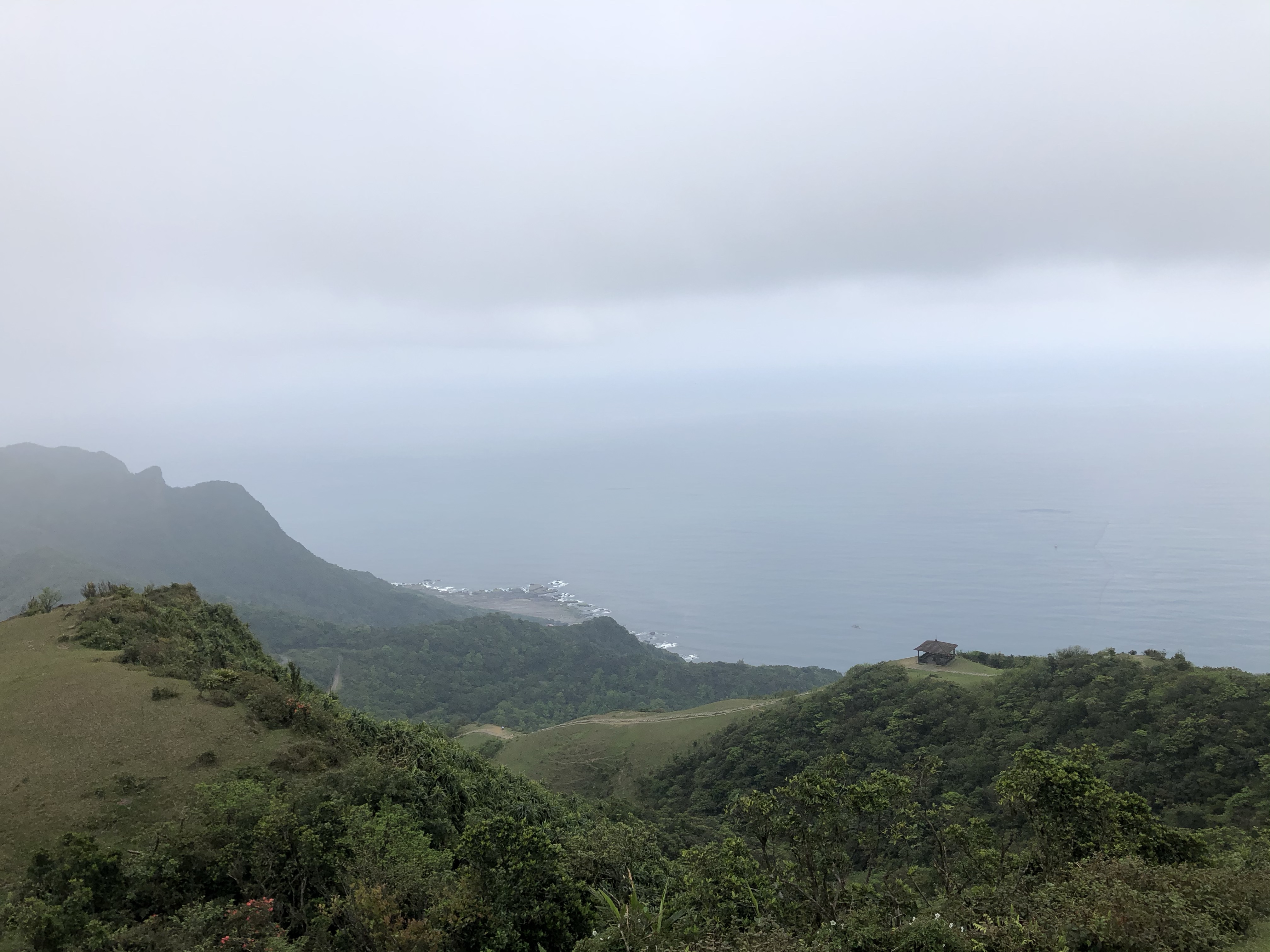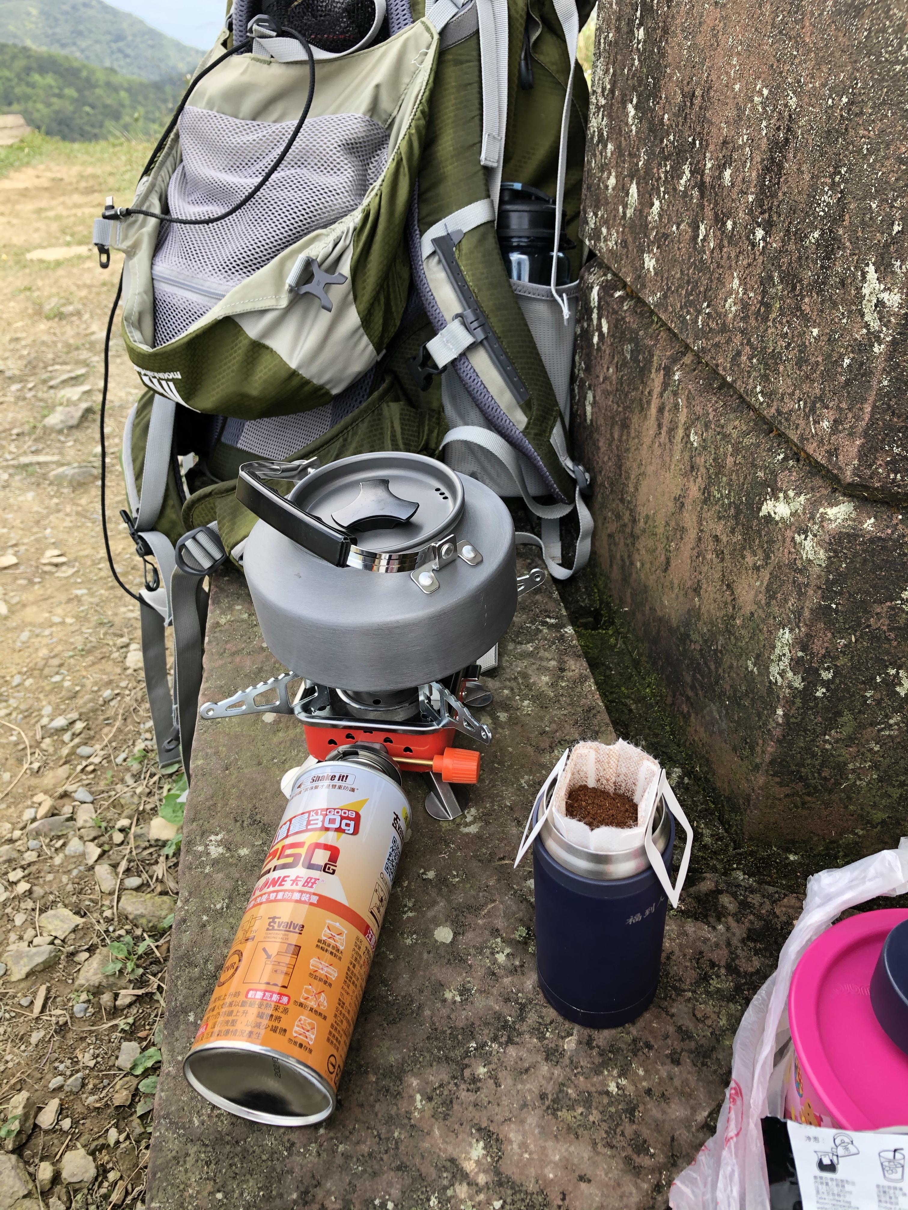 後面將近1公里都算是比較平緩的坡度,一到桃園谷整個豁然開朗,所以拍好照就趕緊走到涼亭的階梯旁(因為裡面全擠滿人了😄)開始煮咖啡、吃鳳梨了!